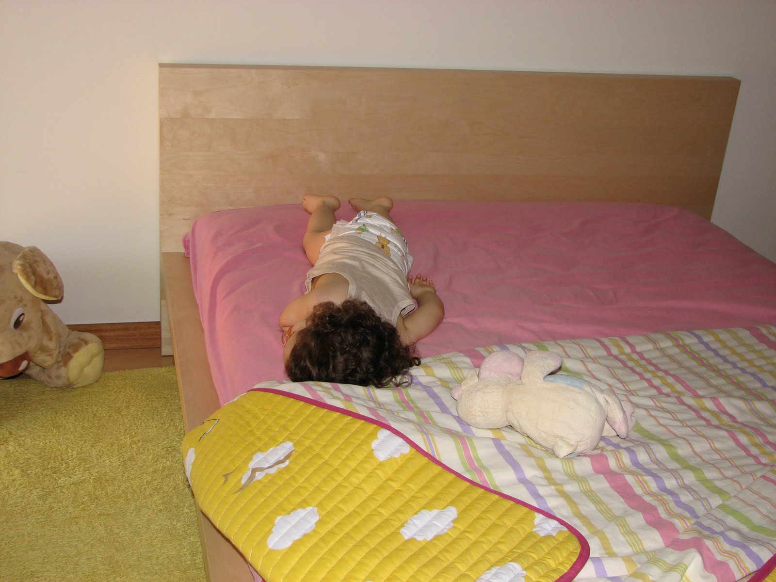 De repente ouvimos o barulho típico de quando ela bate com a cabeça no chão... corremos até ela, à espera do "galo" na testa e nada... algum choro, algum sangue no lábio de baixo, mas mais nada.